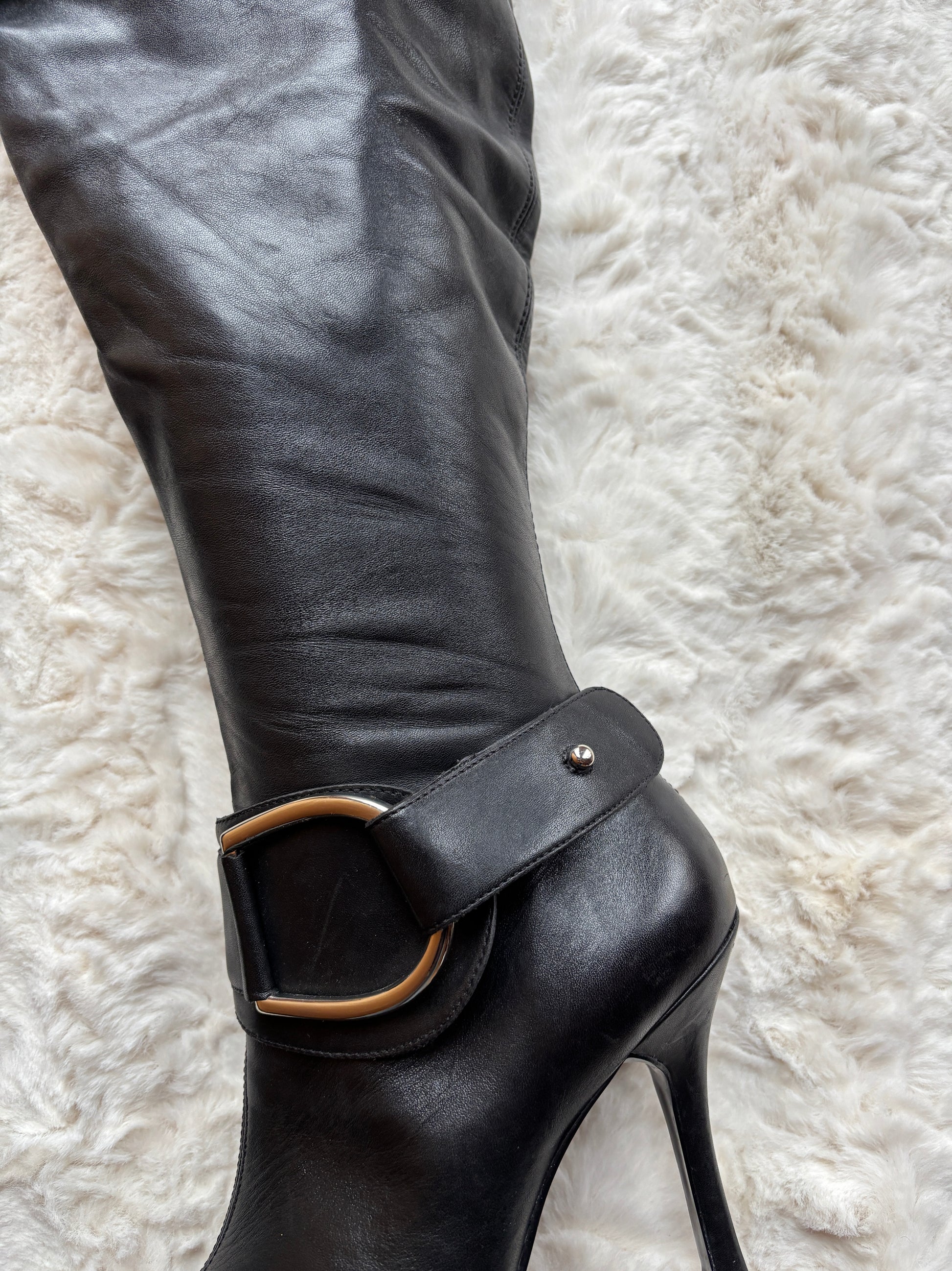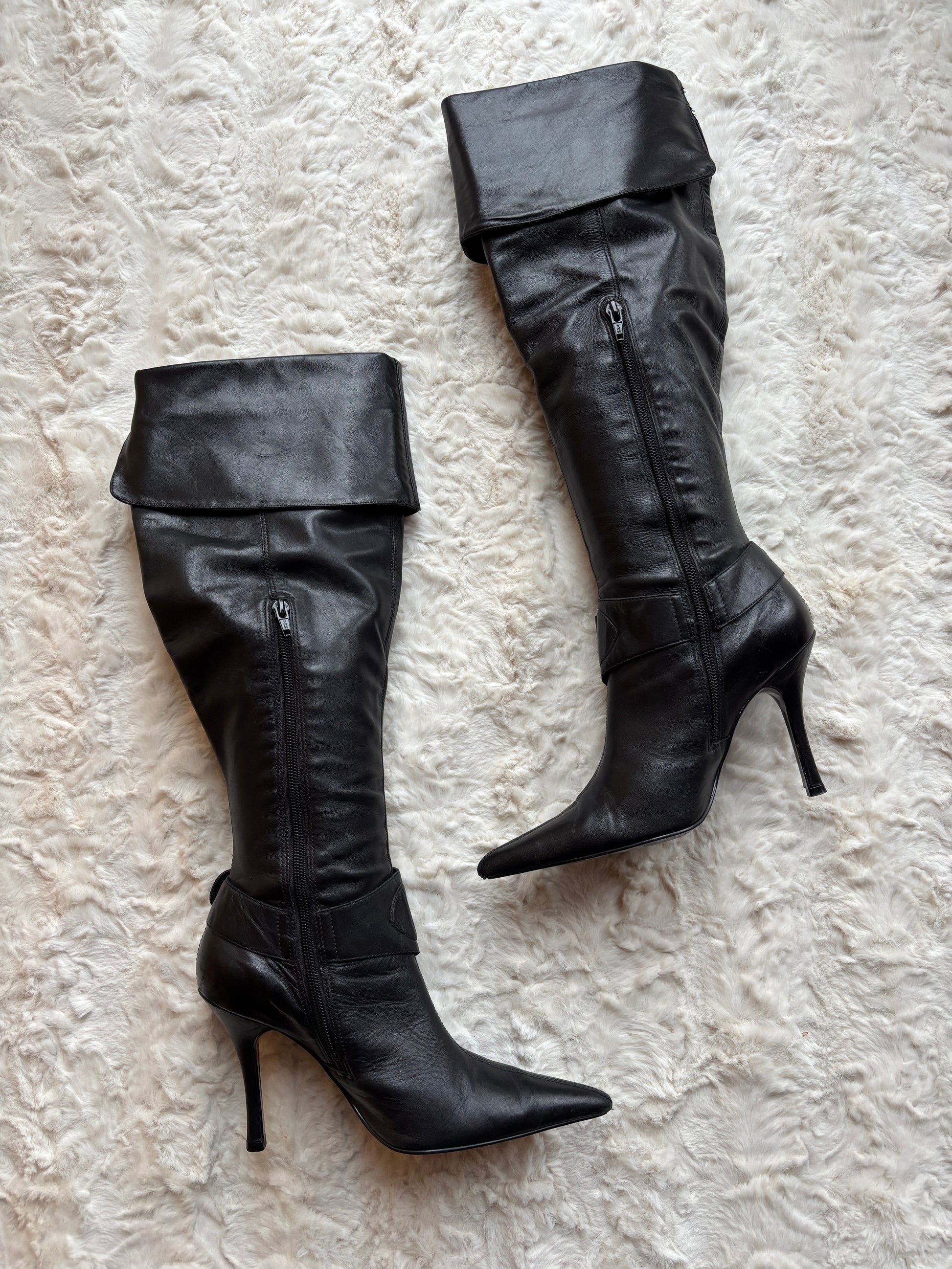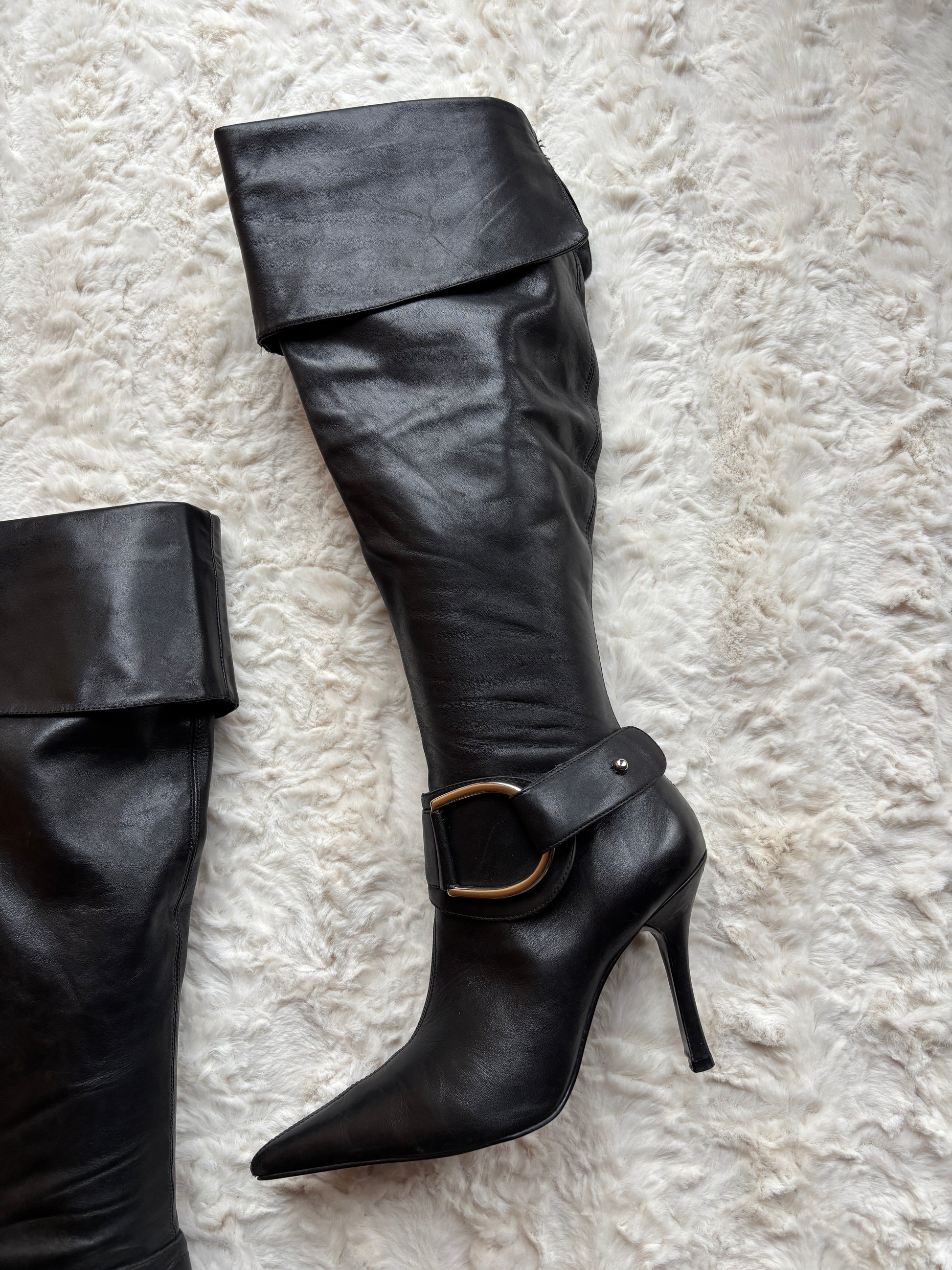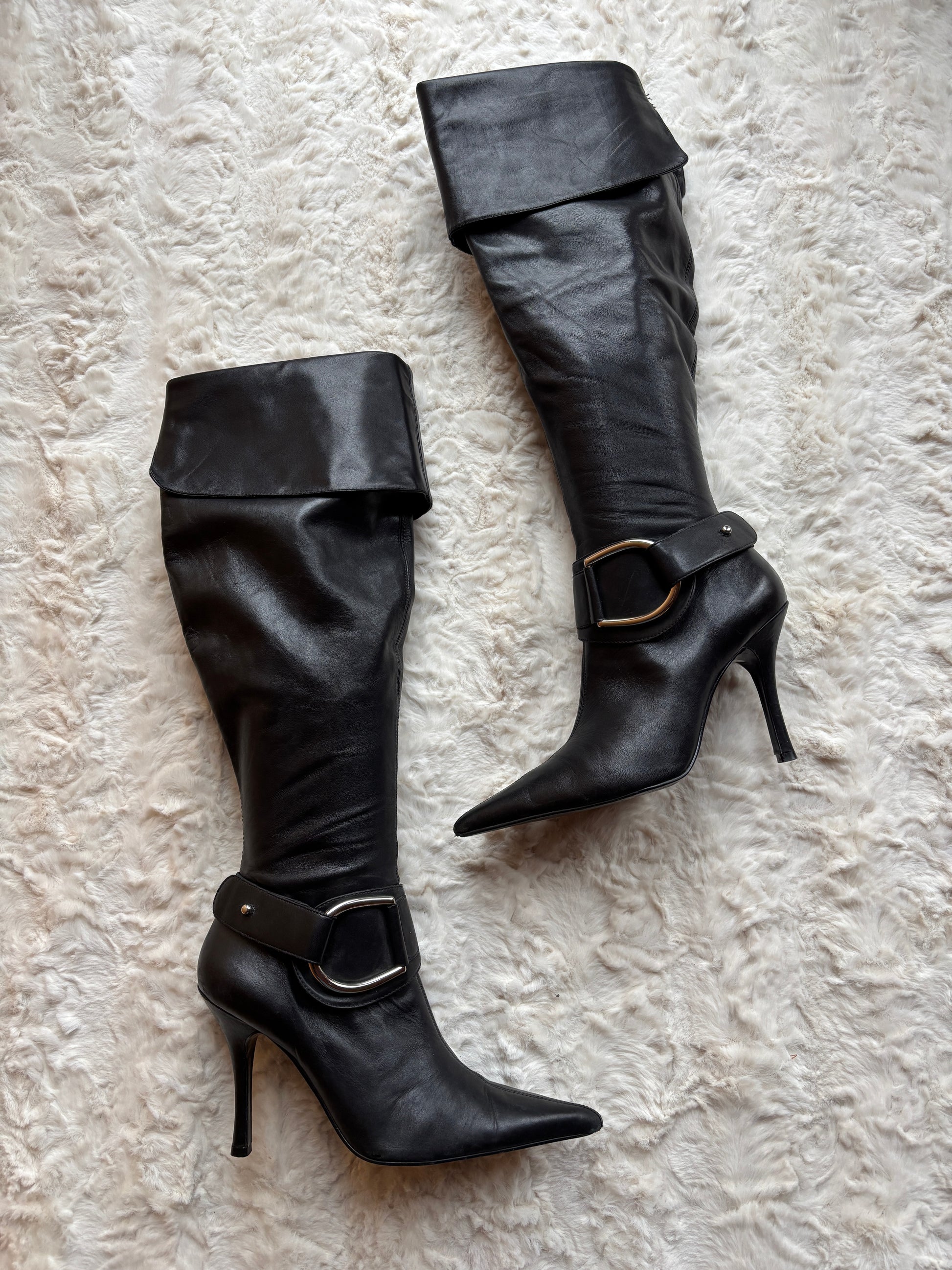 Step into sleek, early-2000s elegance with these striking vintage Dune knee-high boots. Crafted from smooth black leather, they feature a sharply pointed toe and a slim stiletto heel that creates a confident, elongated silhouette. A bolo ankle strap with oversized metal buckle detail adds statement appeal, while the fold-over cuff lends a refined, fashion-forward finish.