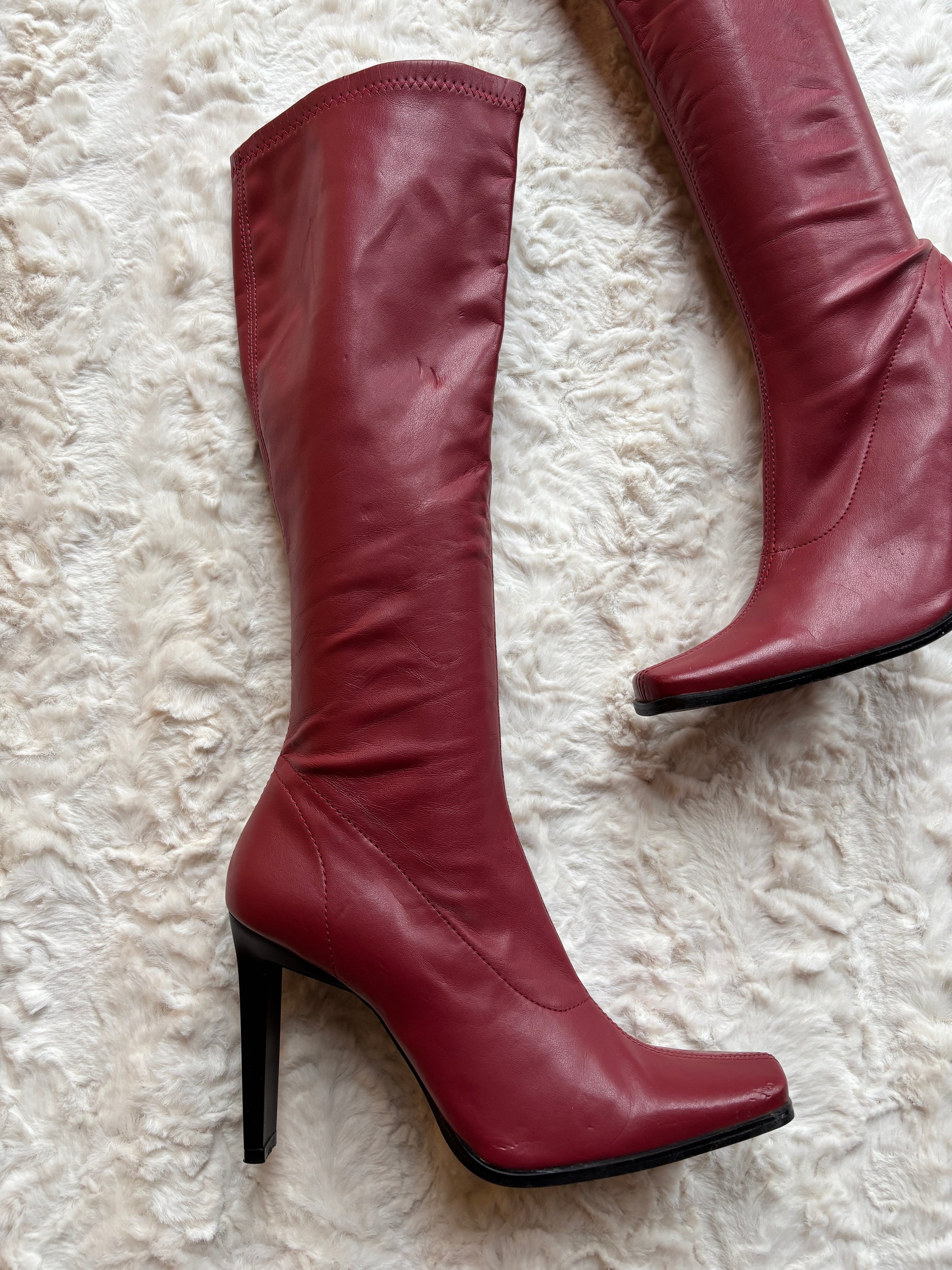 Designed with a square toe and a slim block high heel, these boots balance modern edge with classic appeal. A full-length inner zipper allows for easy on-and-off wear, while the knee-high shaft offers a polished, streamlined fit. Light creasing and minor scuffs are consistent with gentle wear, adding character without detracting from their overall image.