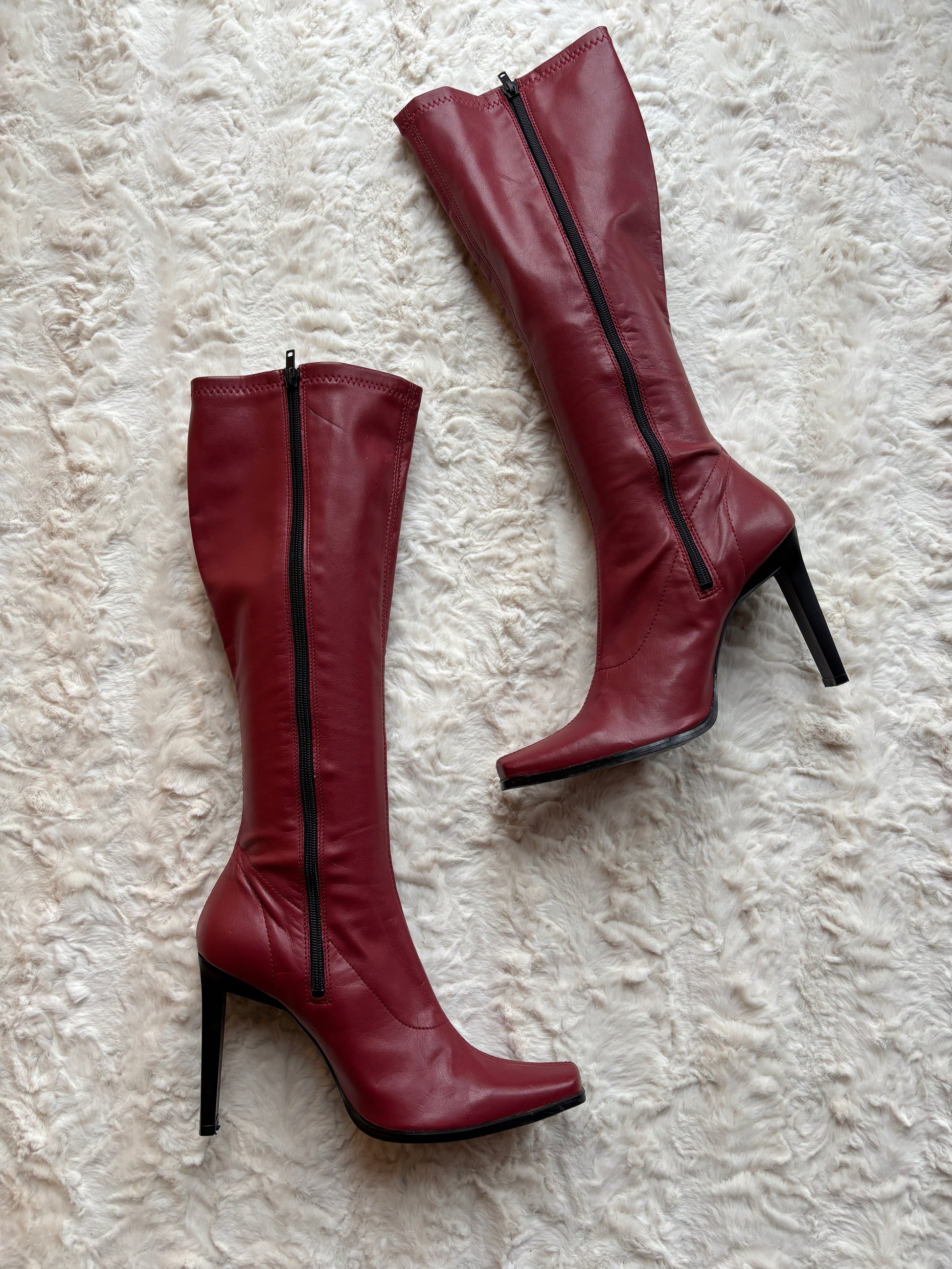 Step into sleek, confident style with these striking Milano Moda knee-high boots. Crafted in a rich burgundy faux leather, they bring a bold pop of color while remaining timeless and versatile. The smooth finish and structured silhouette create a flattering, leg-lengthening effect that elevates both casual and dressed-up looks.