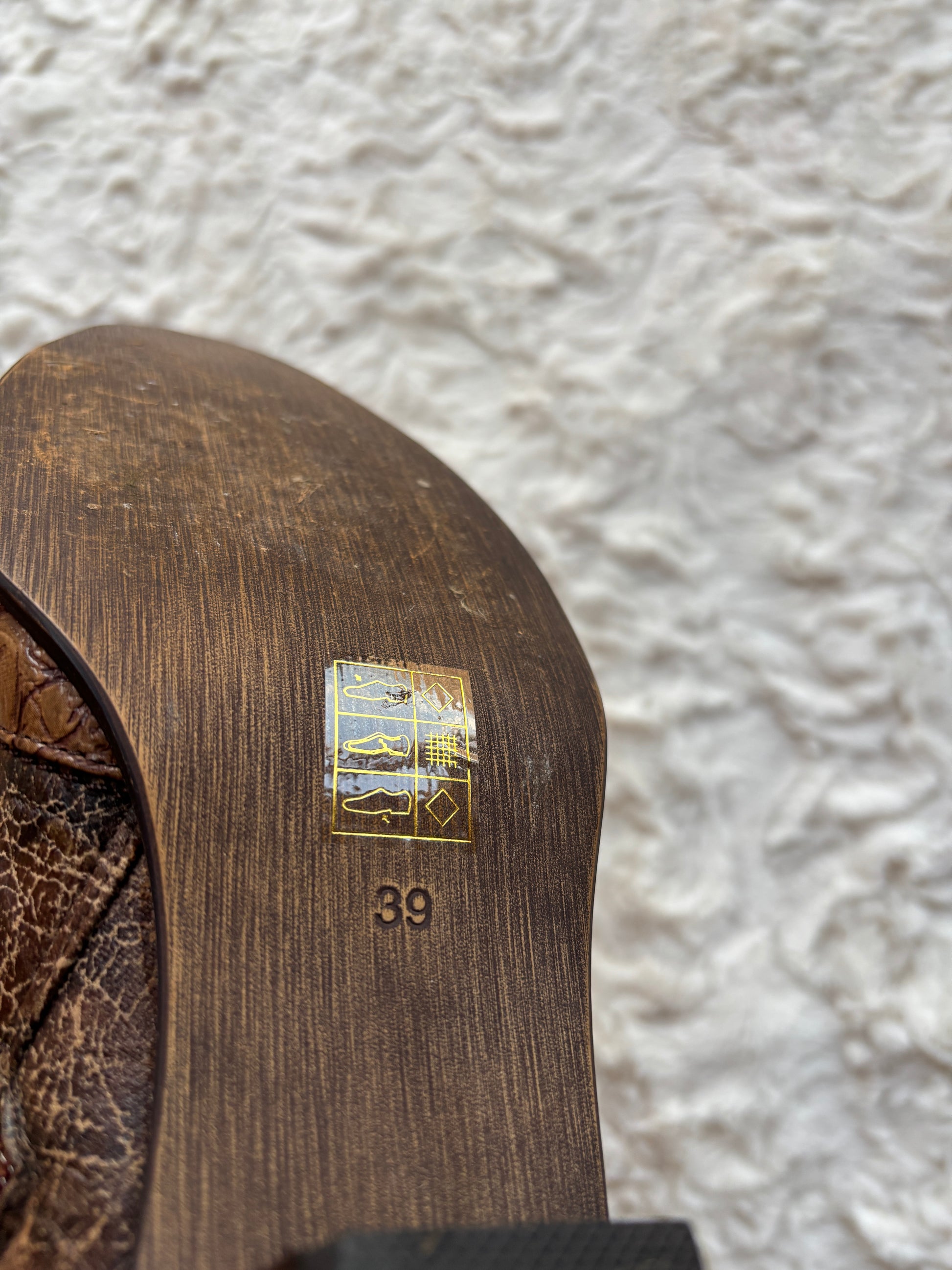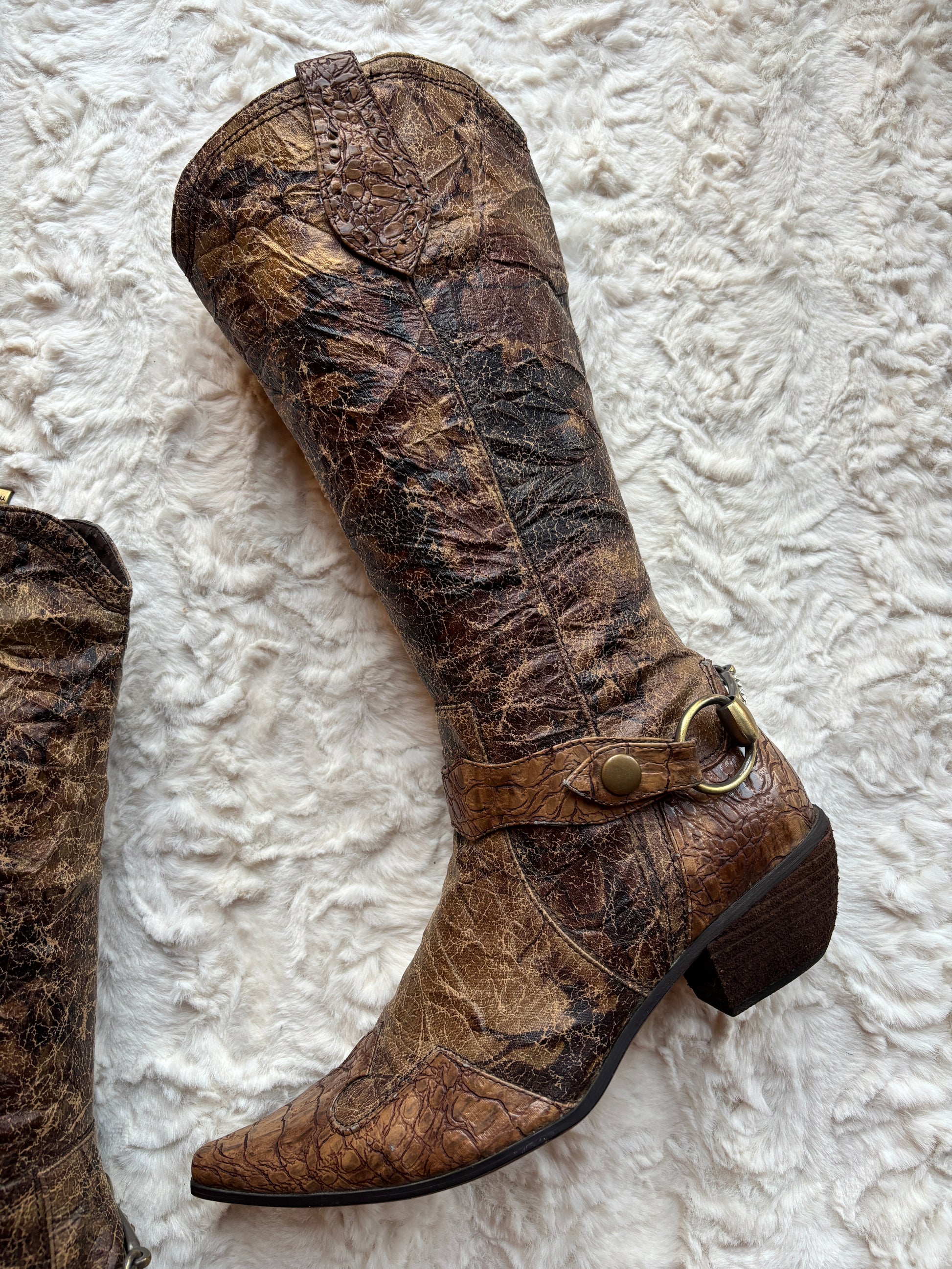 A bold vintage statement with classic western influence, these cowboy boots are crafted from faux leather with a striking crackled, distressed finish. The rich mix of earthy brown tones gives them a beautifully worn-in look, capturing that authentic vintage feel while remaining lightweight and easy to wear.