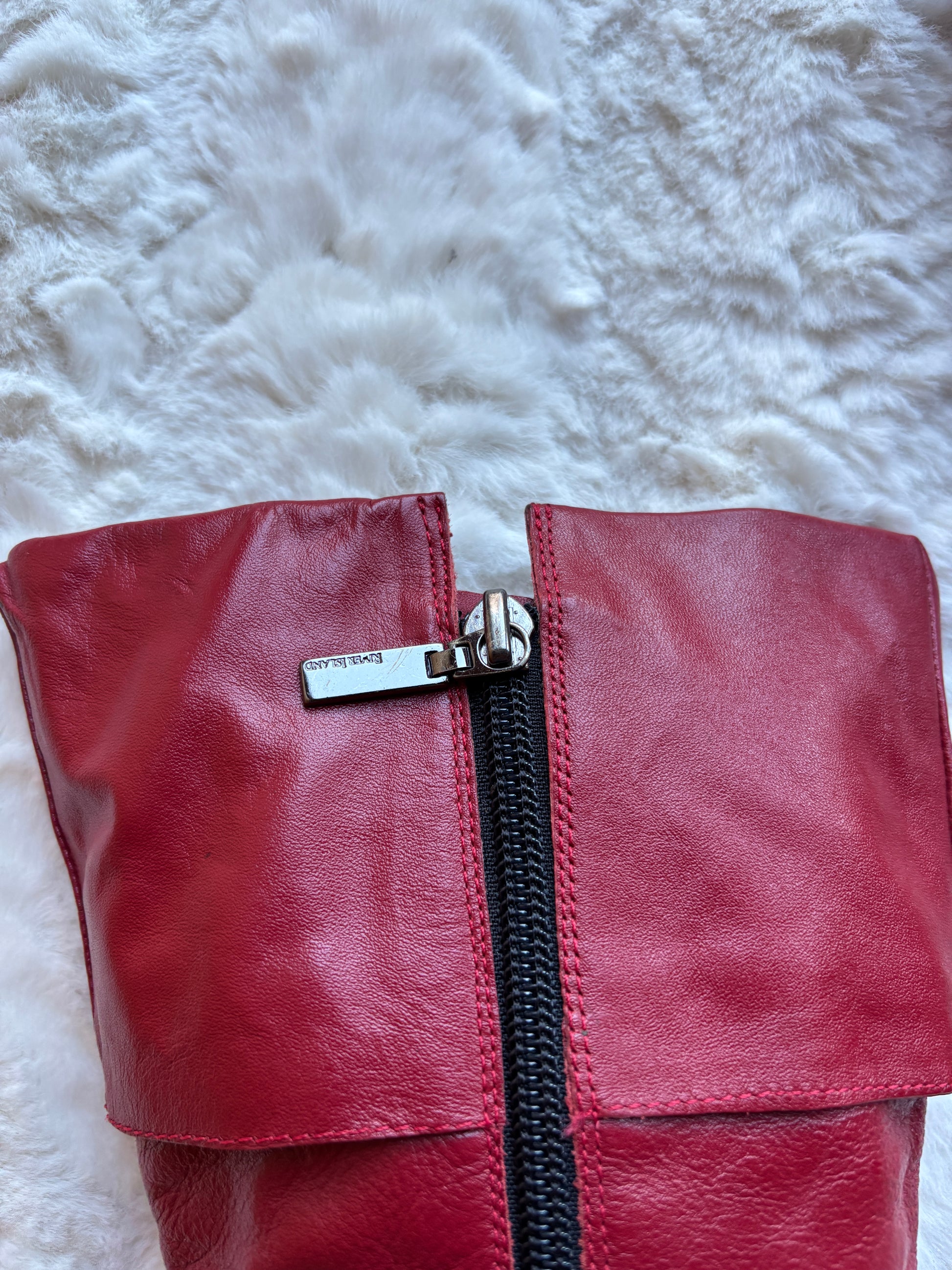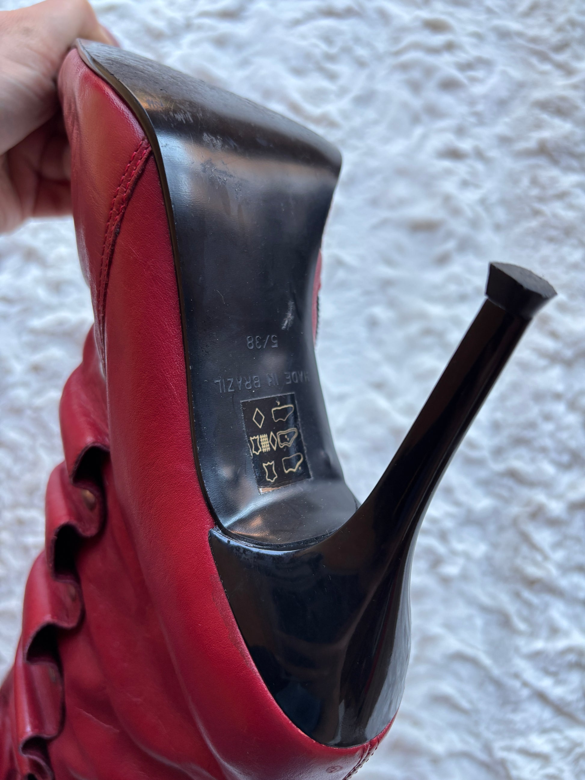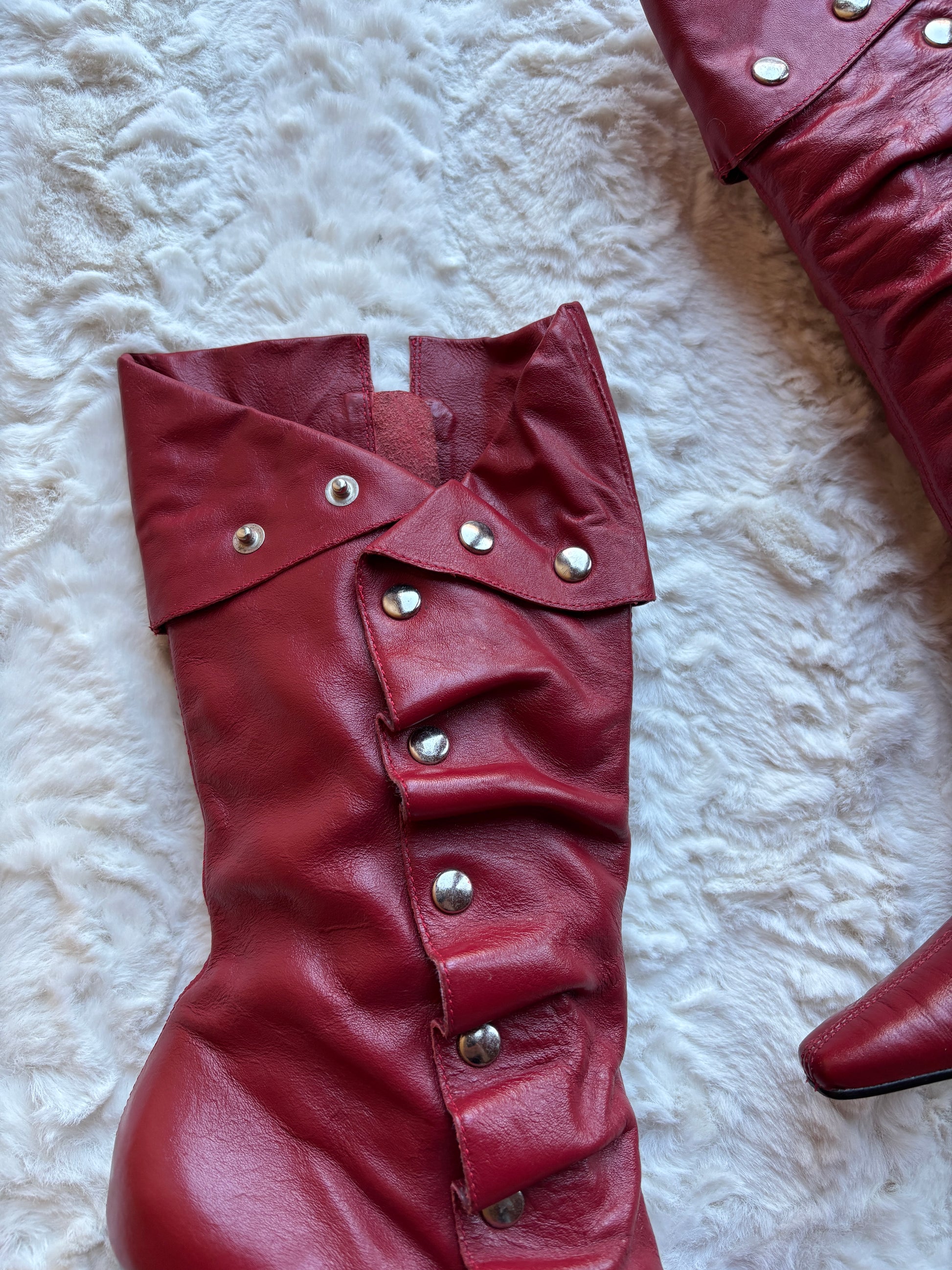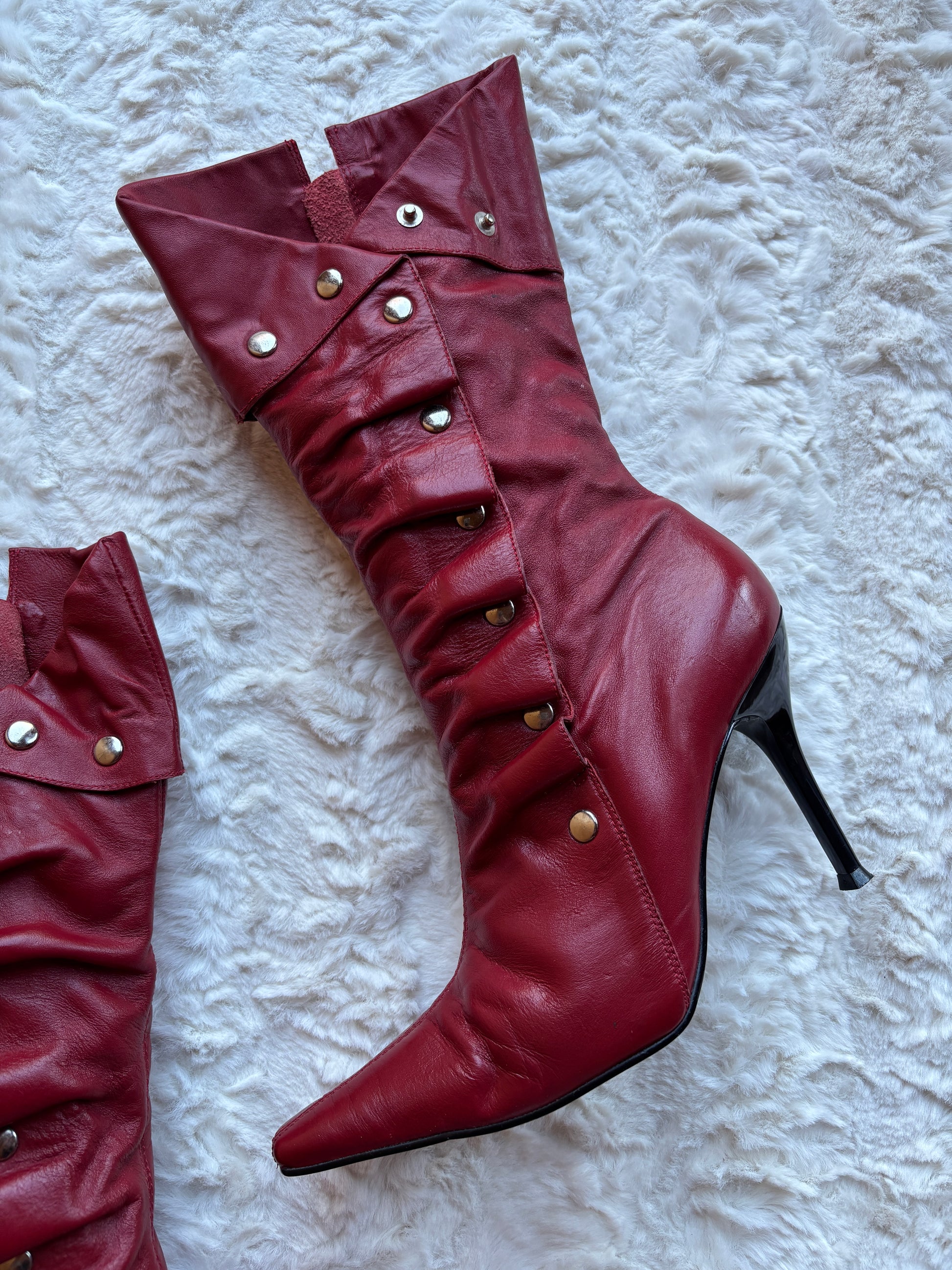 A bold Y2K statement with undeniable attitude, these vintage River Island boots feature rich red leather accented with silver-tone stud detailing for a striking, early-2000s look. The softly ruched shaft and layered panel construction add texture and movement, giving the boots a distinctive silhouette that feels both edgy and feminine.