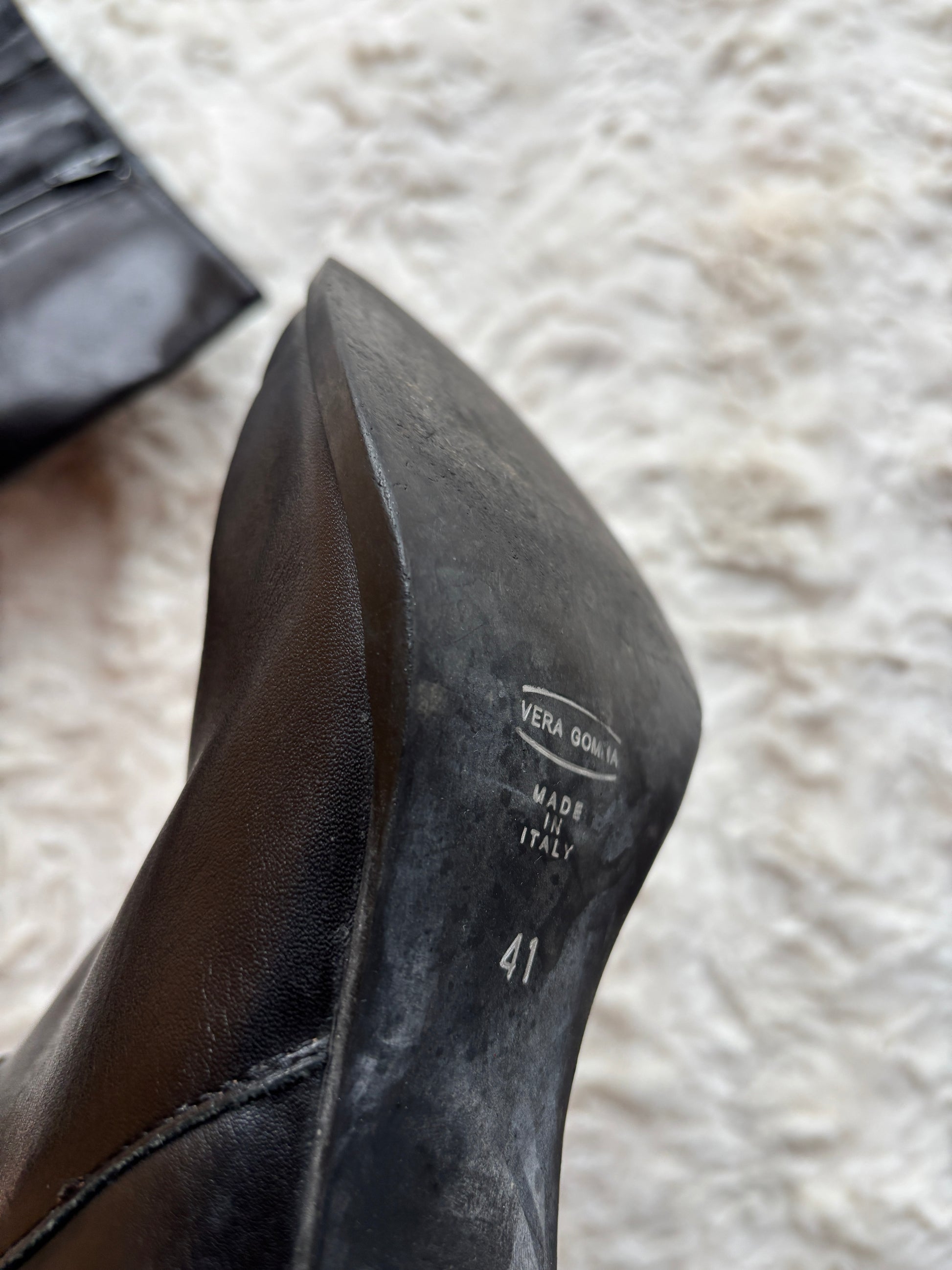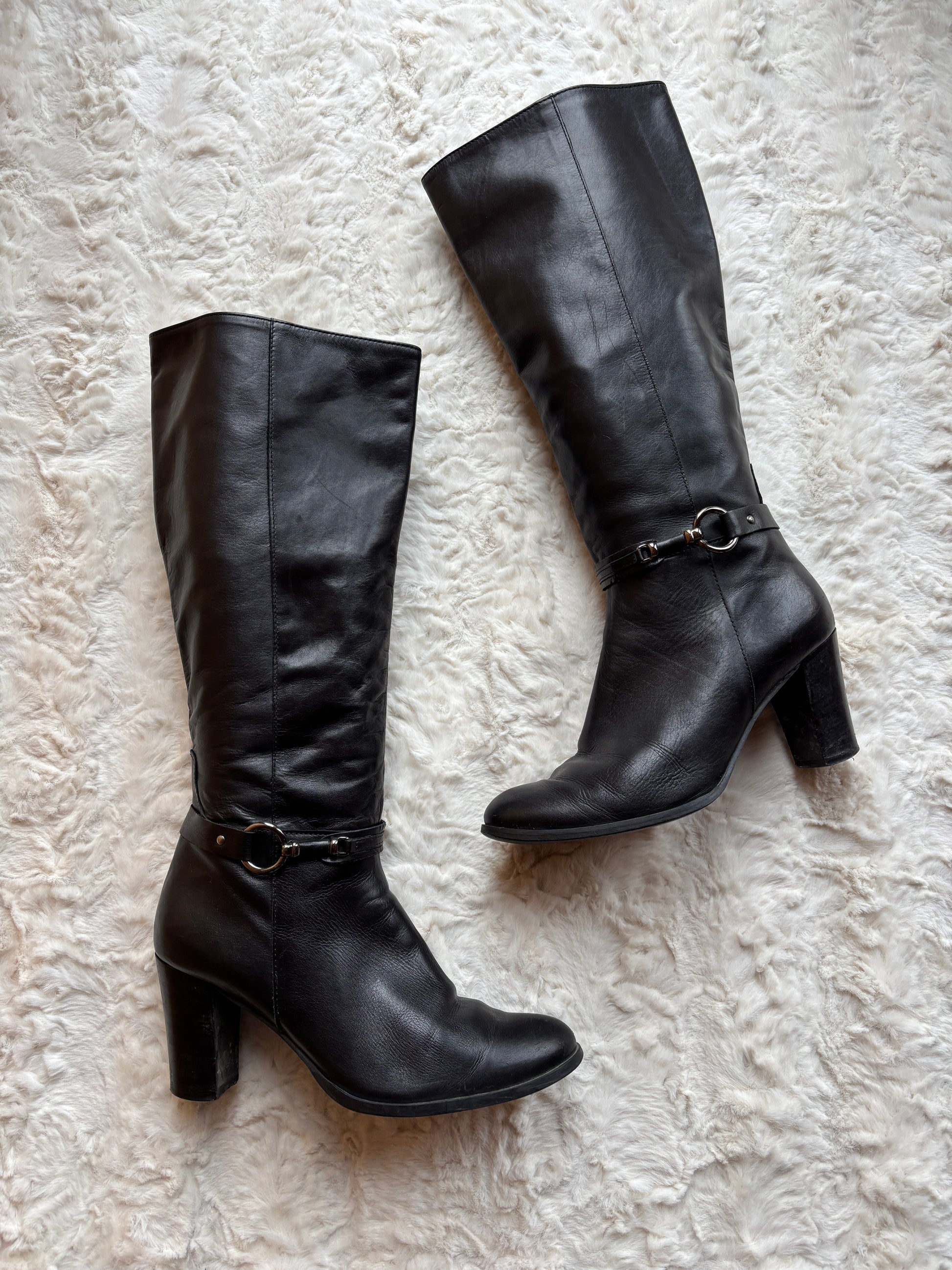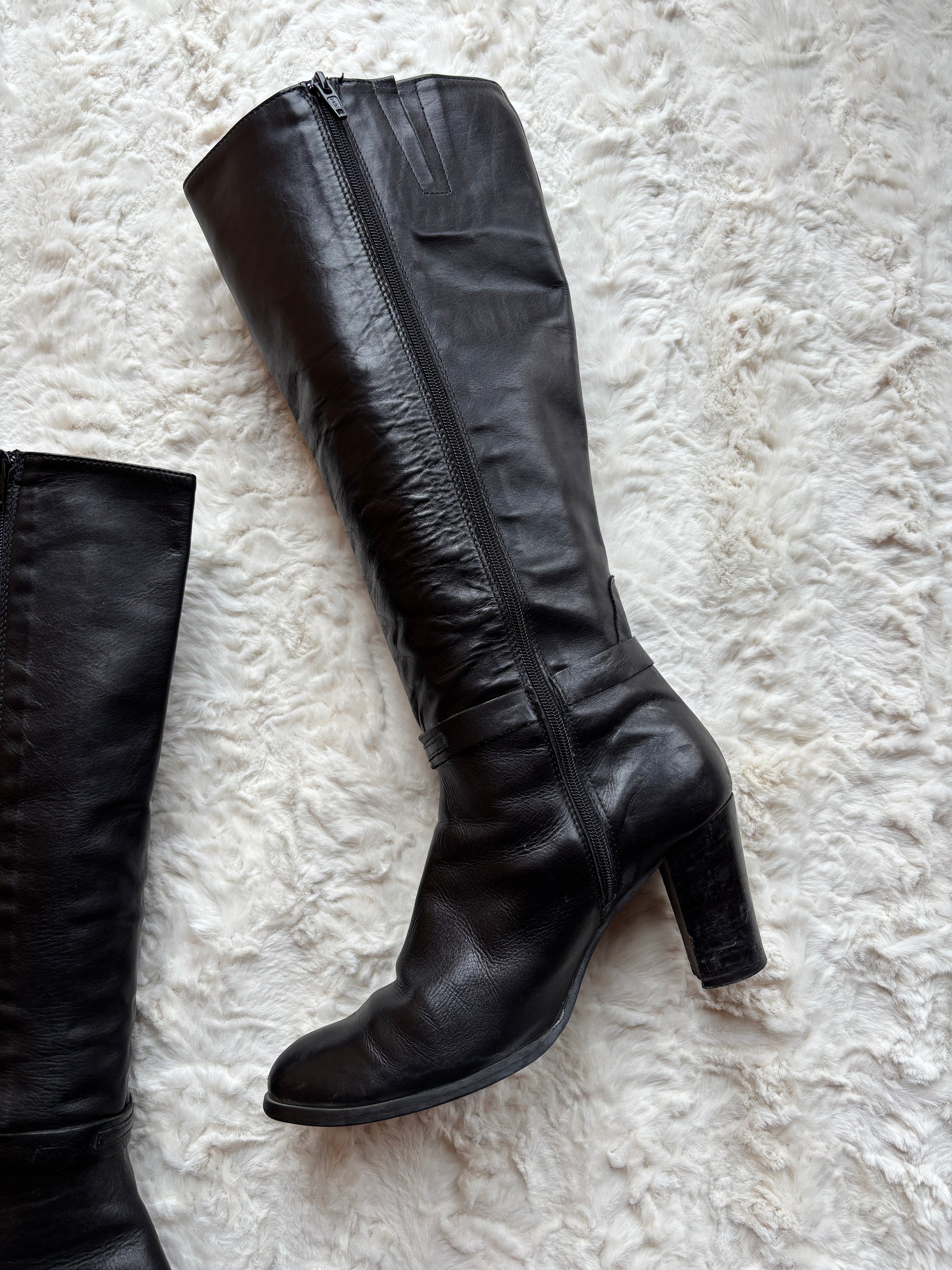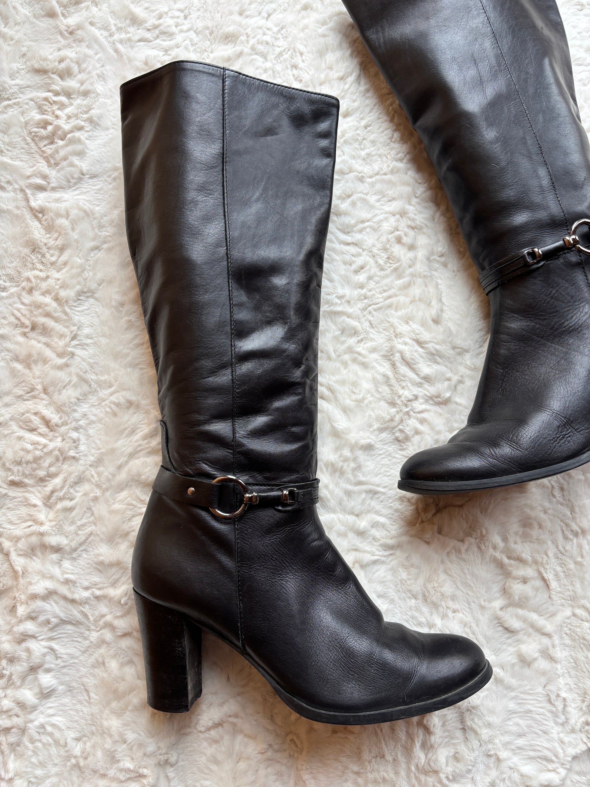 Step into timeless vintage elegance with these classic black leather knee-high boots. Crafted from smooth, supple leather, they feature a softly rounded toe and a sturdy block heel that offers both height and all-day wearability. A subtle ankle strap with metal ring detail adds understated character while keeping the overall look clean and versatile.