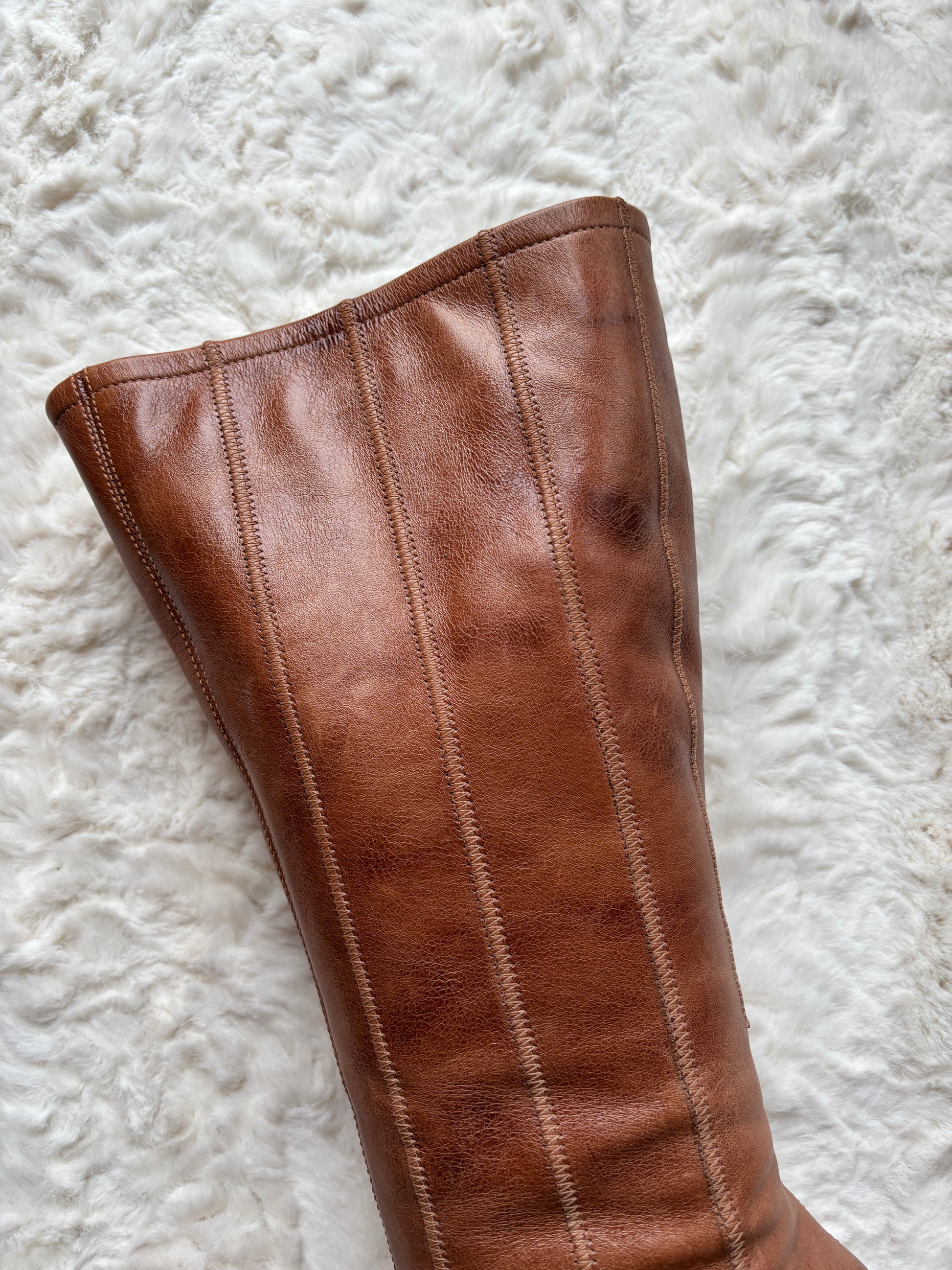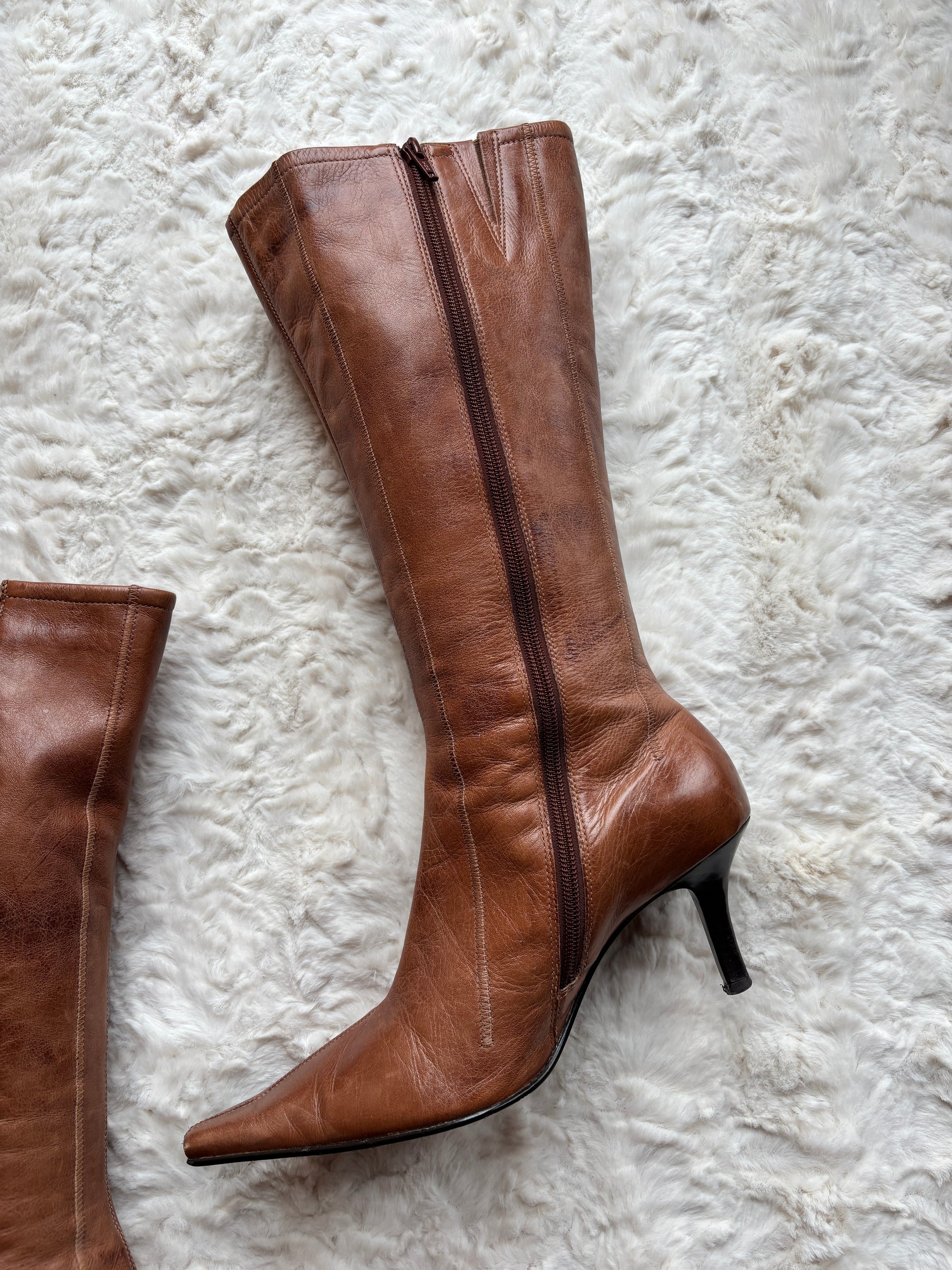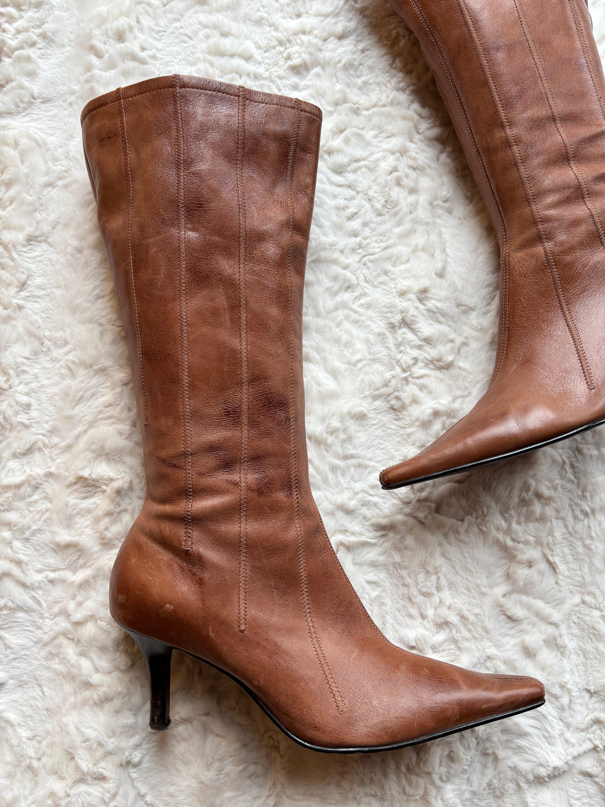 Step into sleek vintage sophistication with these elegant Faith knee-high boots. Crafted from smooth brown leather with a rich, warm tone, they feature a sharply pointed toe and a slim stiletto heel that creates a refined, elongated silhouette. Vertical seam detailing along the shaft enhances their tailored look, giving them a distinctly polished, early-2000s-inspired edge.
