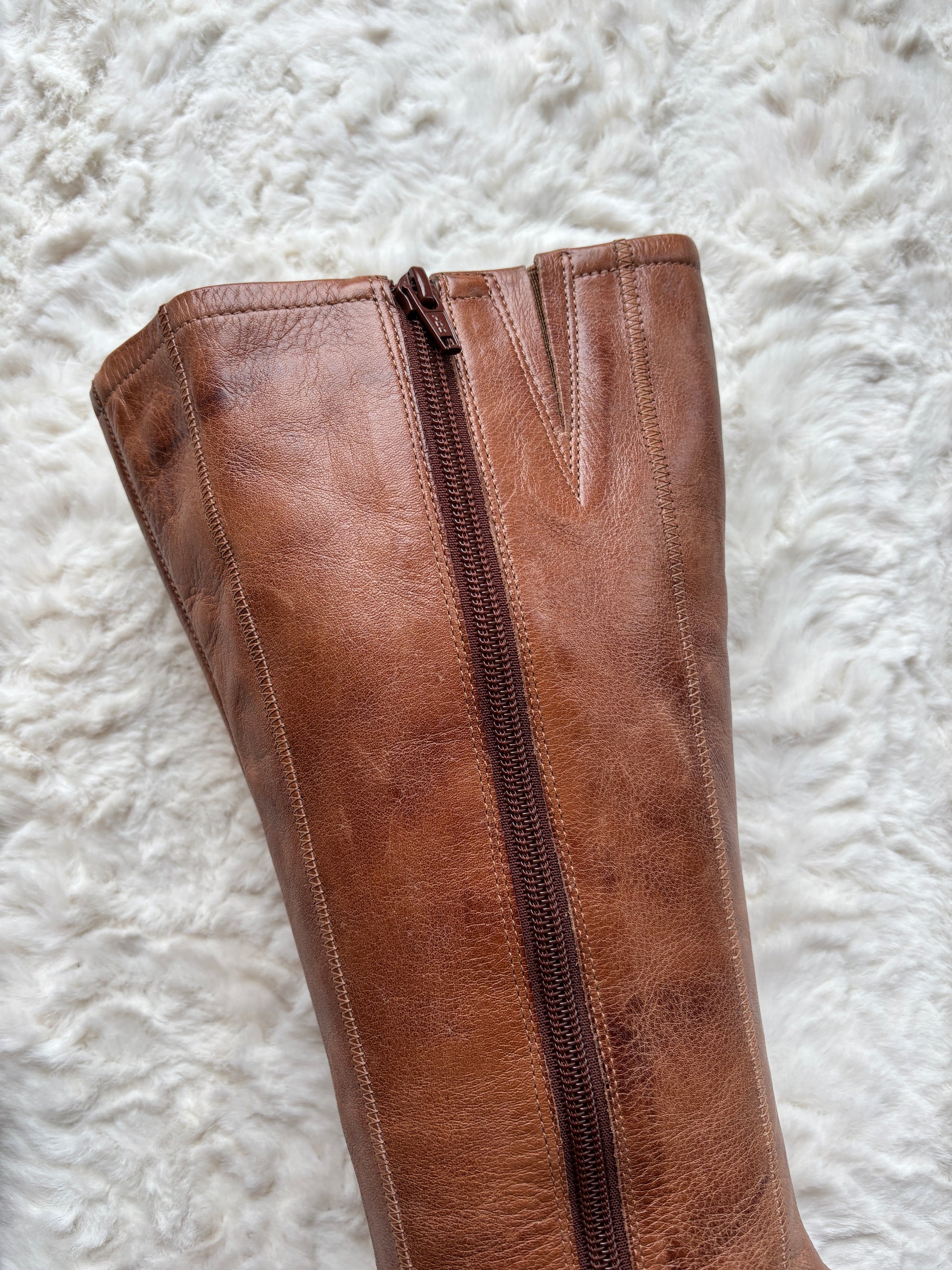 Designed with an inner side zipper for easy wear and a softly structured knee-high shaft, these boots balance femininity with confident vintage style. Natural creasing and light signs of wear add character and authenticity, highlighting the quality of the leather without compromising their overall shape.